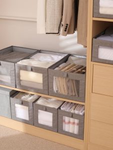 Tutti i capi della stagione appena passata posizionali in delle scatole in tessuto.